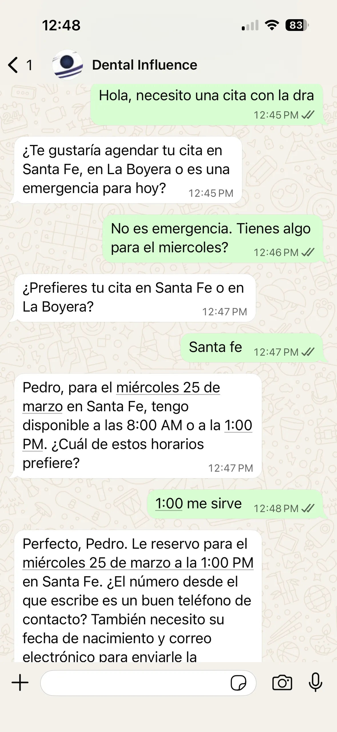 Tu recepcionista es invaluable — y Alesia no viene a reemplazarla. Viene a cubrir todo lo que ella físicamente no puede hacer: los mensajes que llegan después de las 6pm, los que quedan sin respuesta durante el almuerzo, los que se pierden cuando hay tres llamadas al mismo tiempo. Alesia trabaja las 24 horas. Tu recepcionista descansa. Juntas, no se pierde ningún paciente.